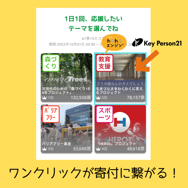アプリユーザーが1日1回、投票に参加し、その得票数の順位に応じて、株式会社 ロイヤリティ マーケティングが各テーマの取り組みに寄付をします。